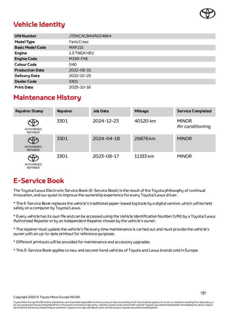 În locul carnetului tipărit, fiecare autoturism Toyota are acum o înregistrare digitală unică, asociată seriei de șasiu. Această înregistrare este actualizată automat după fiecare revizie sau montaj de accesorii și este stocată în siguranță în sistemele Toyota.
